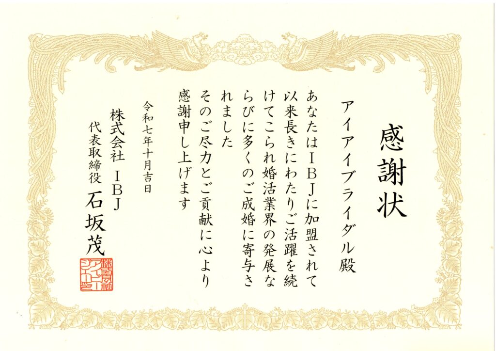 IBJより成婚貢献の感謝状を受賞しました。